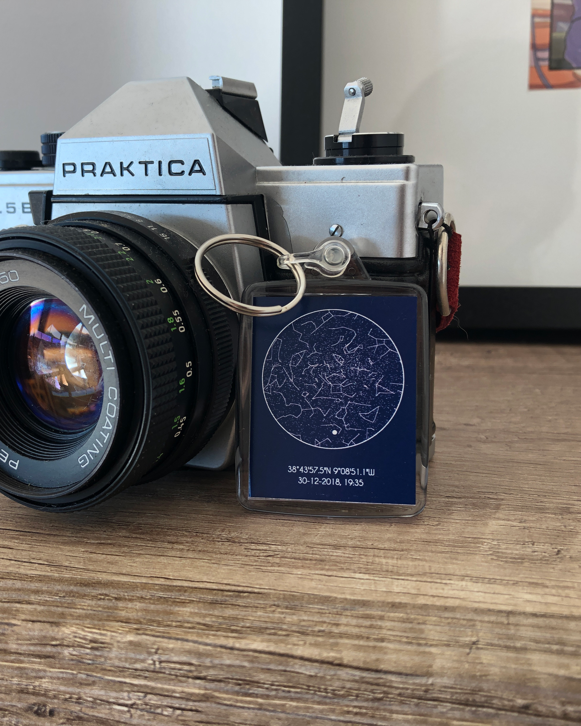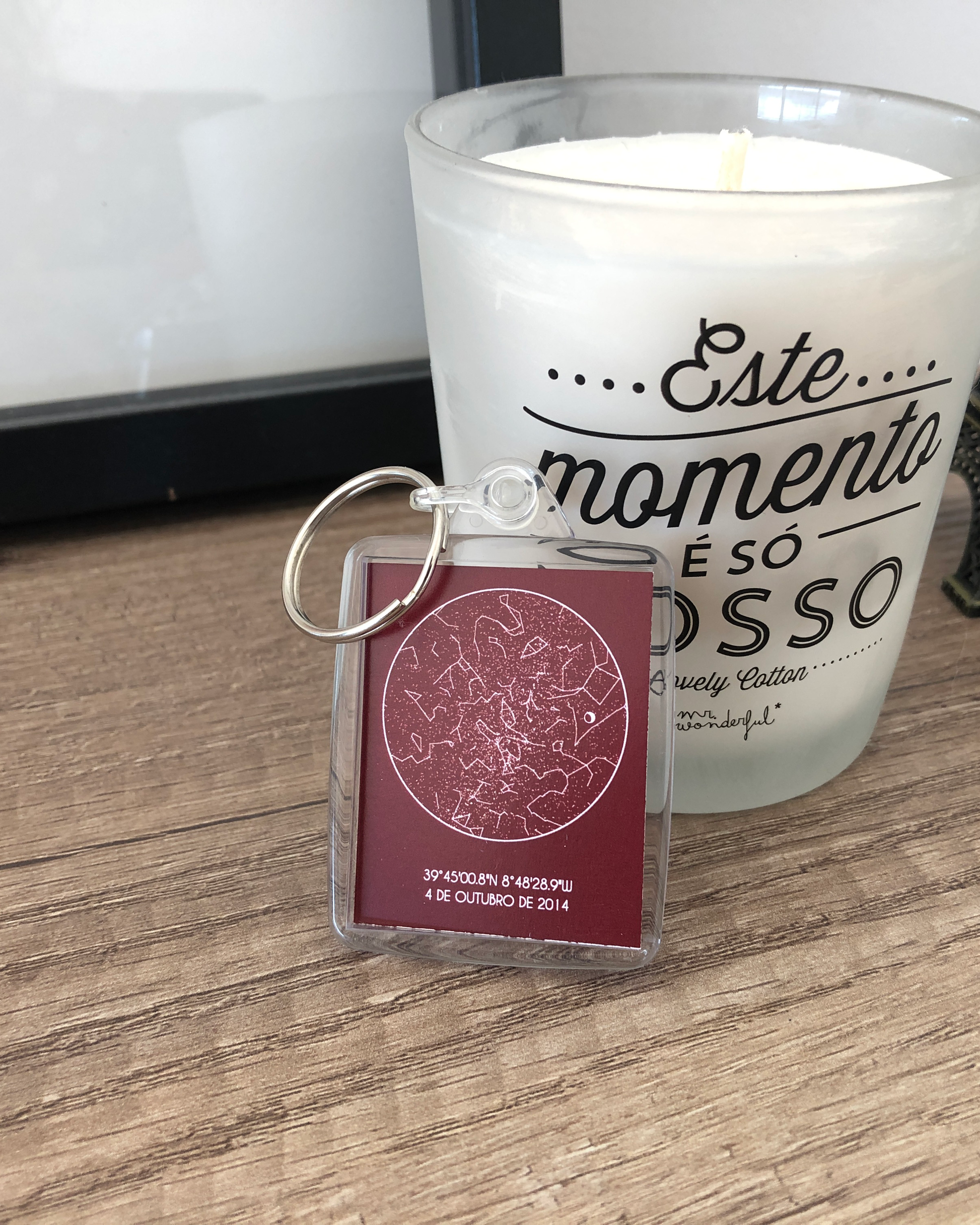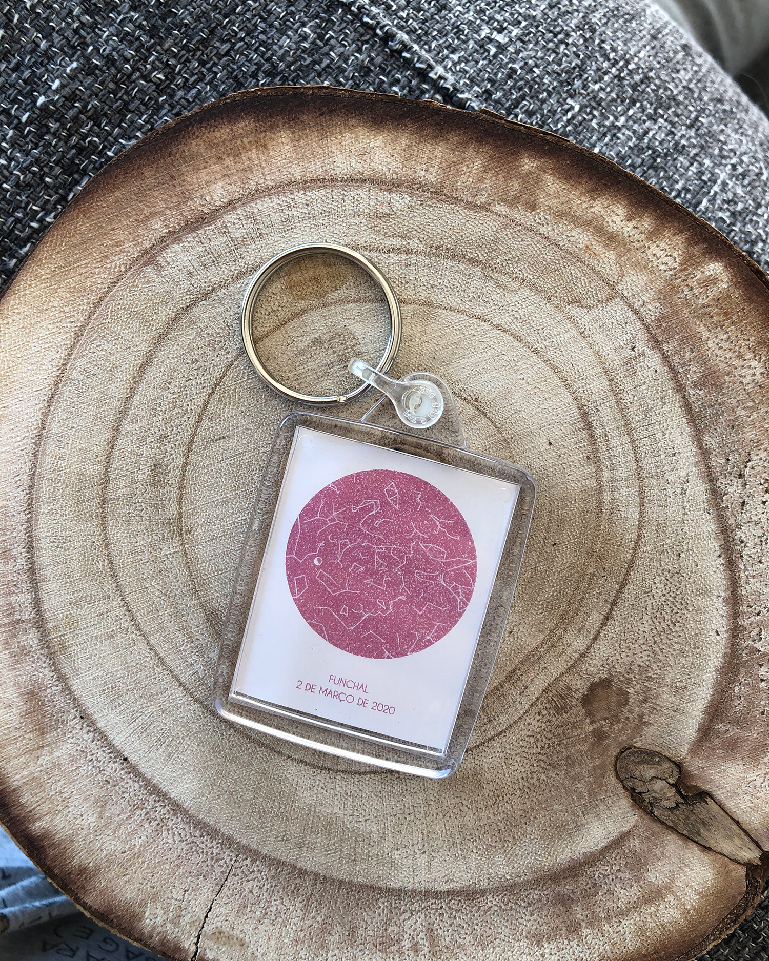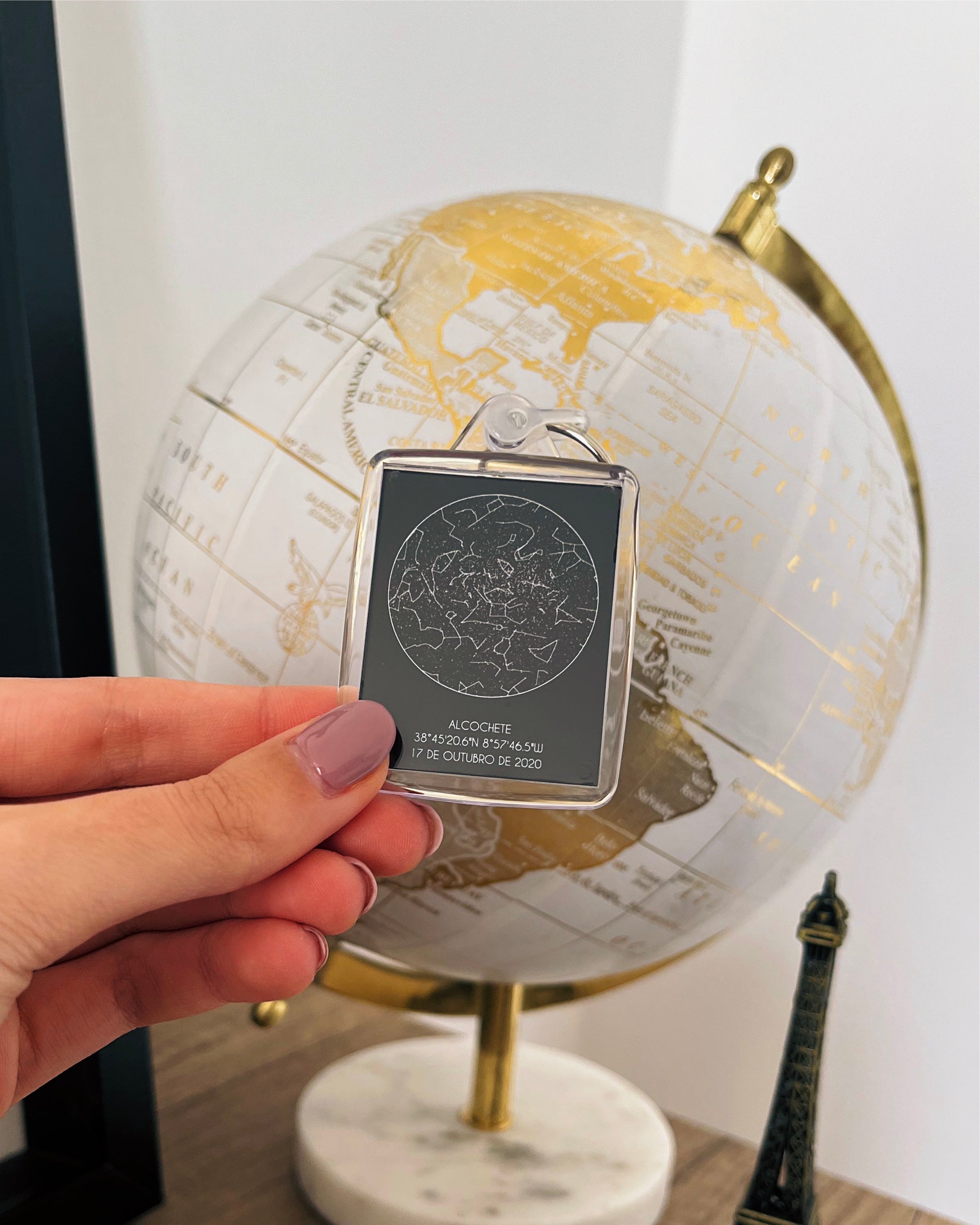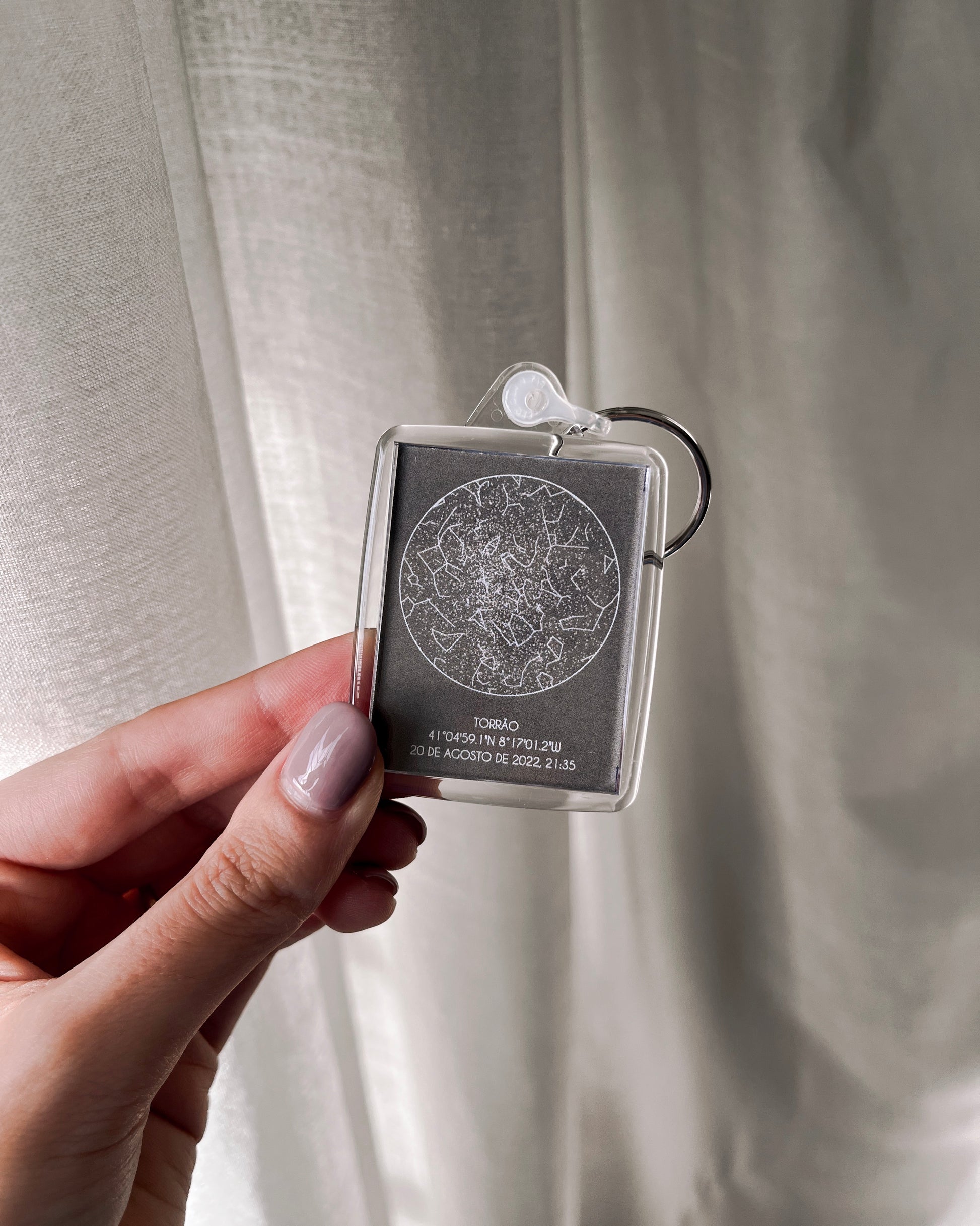 Este Porta-chaves tem um Mapa de Estrelas em cada uma das faces. Assim sendo, tens dois momentos especiais eternizados no mesmo Porta-chaves.